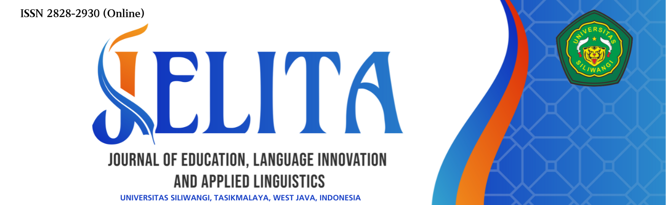 Journal of Education, Language Innovation, and Applied Linguistics (JELITA) is a peer-reviewed international journal published by Lembaga Penelitian, Pengabdian Kepada Masyarakat dan Penjaminan Mutu Pendidikan (LP2M-PMP), Universitas Siliwangi, West Java, Indonesia (E-ISSN: 2828-2930). The journal presents research and development in education, language innovations, and applied linguistics.